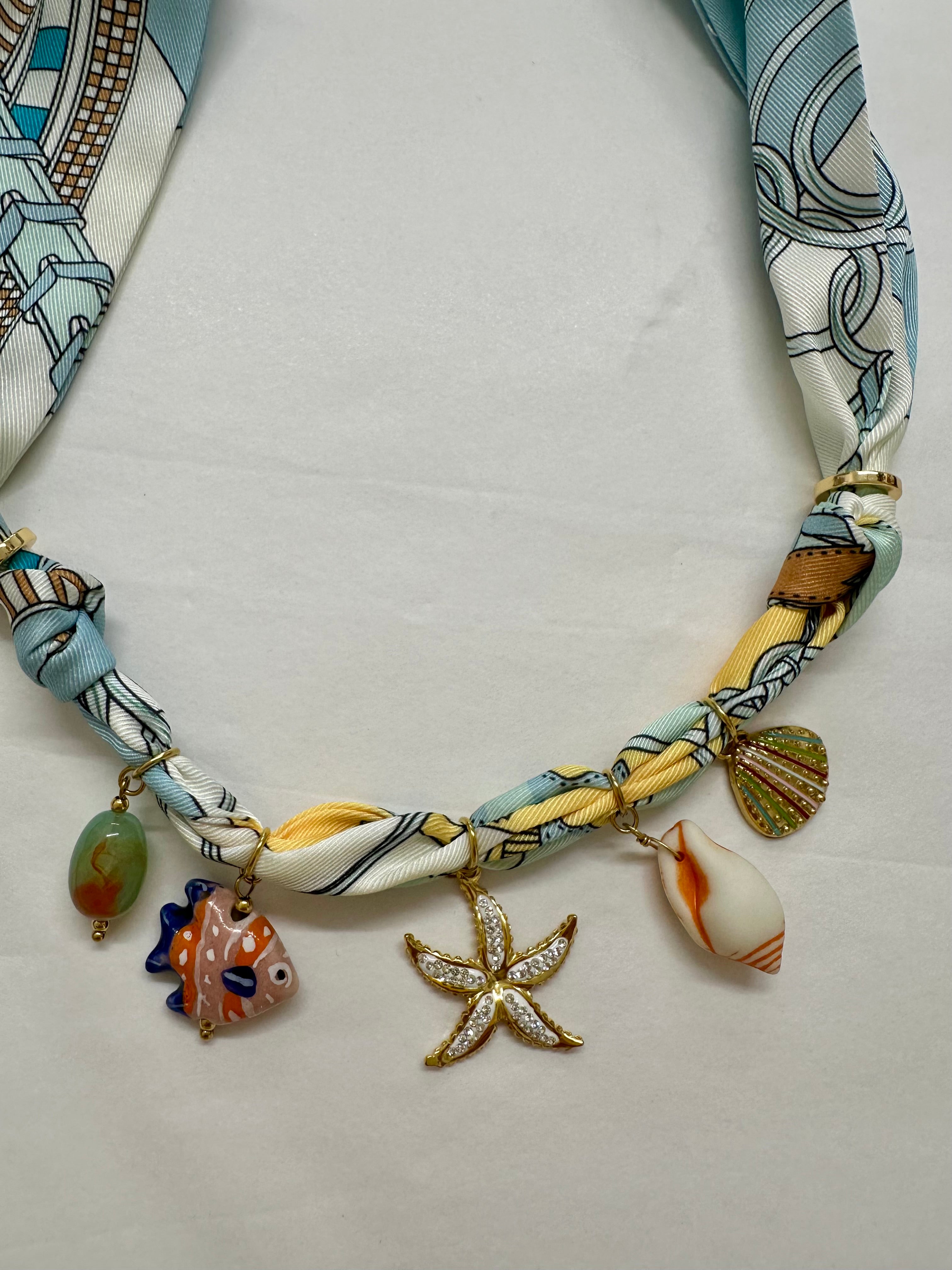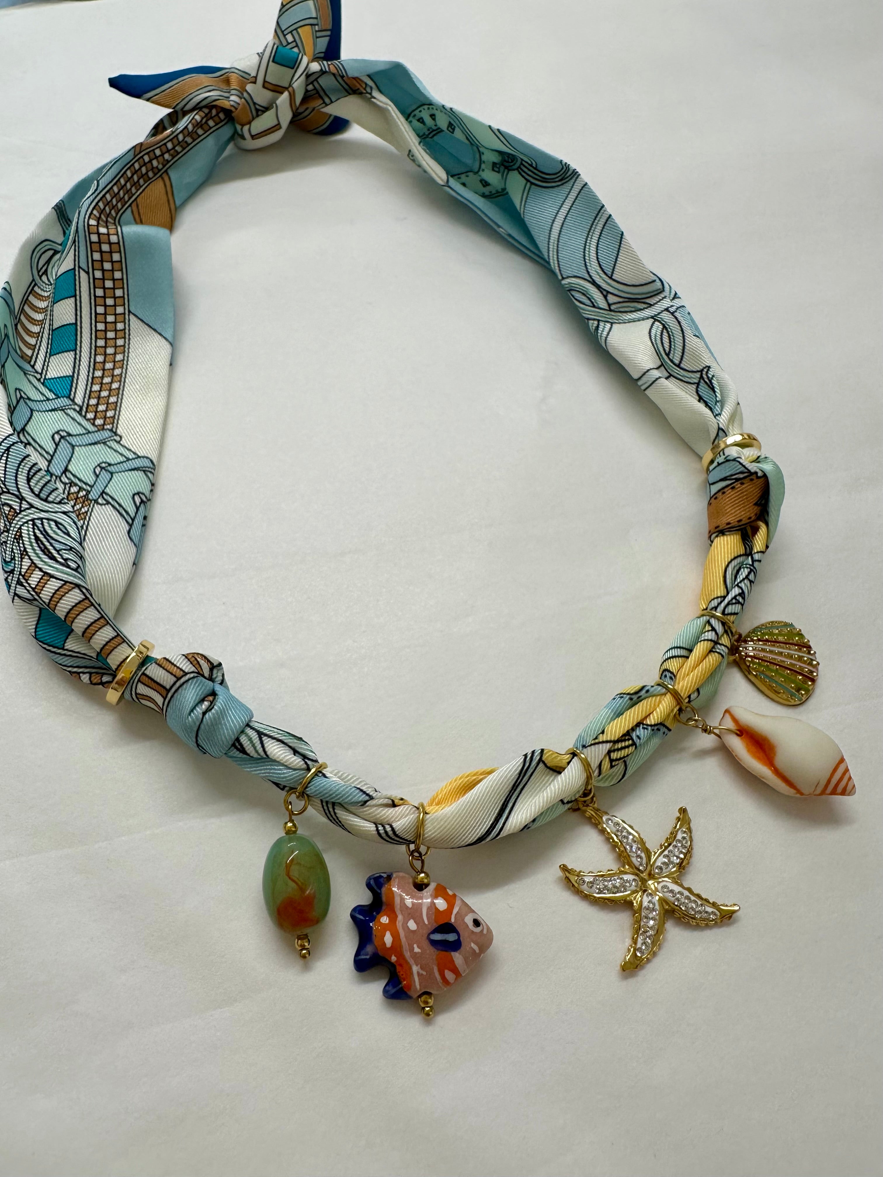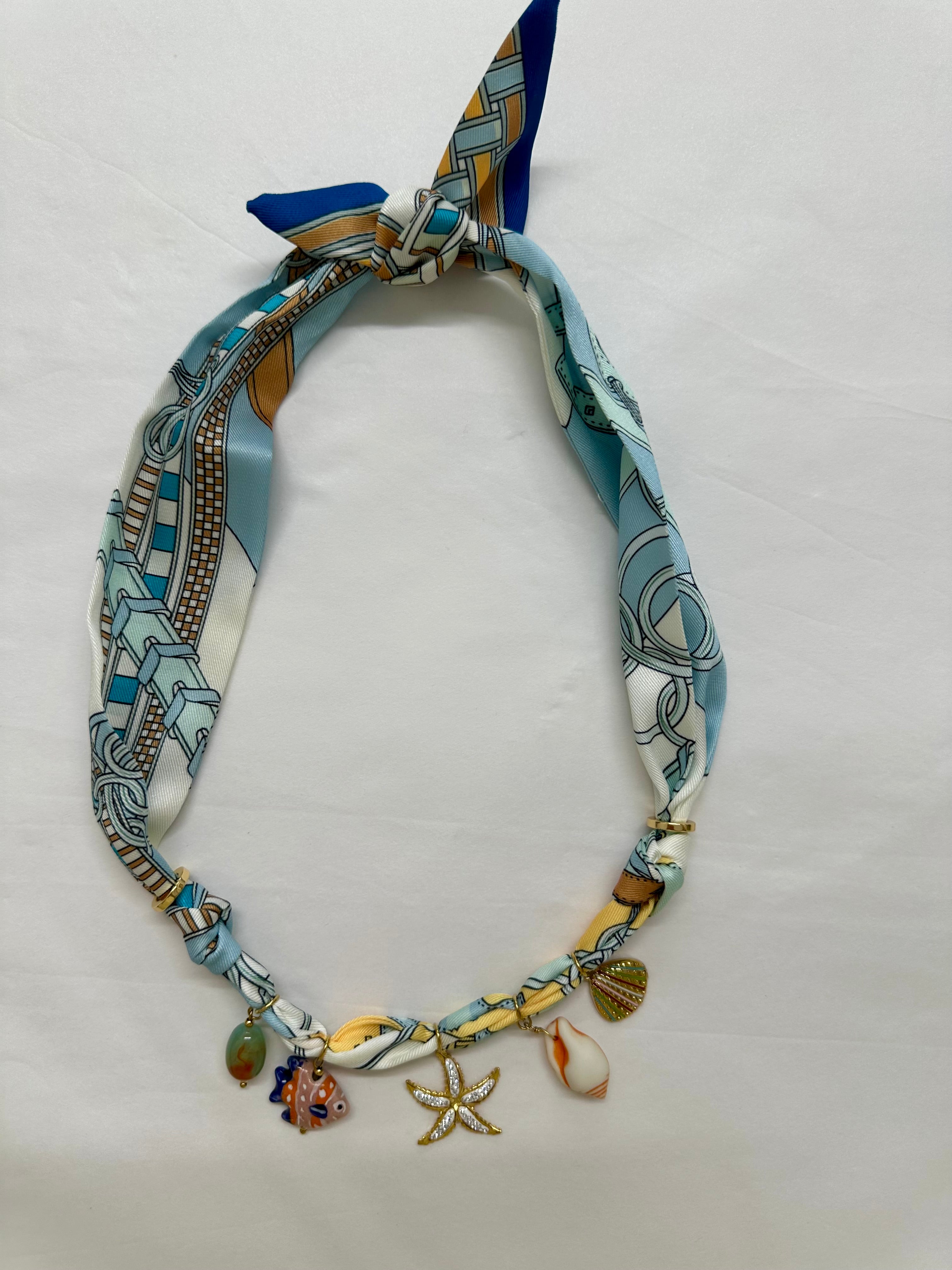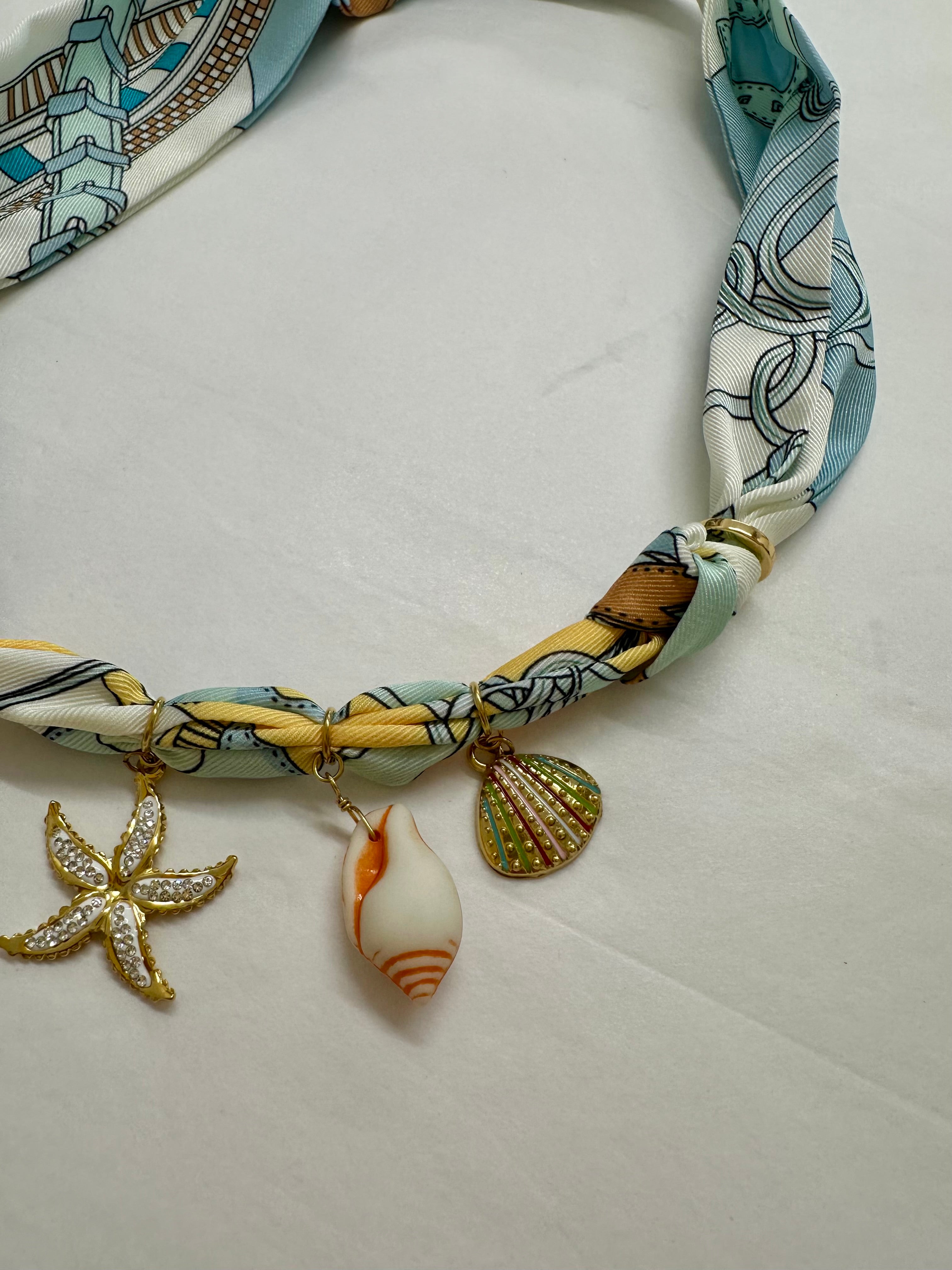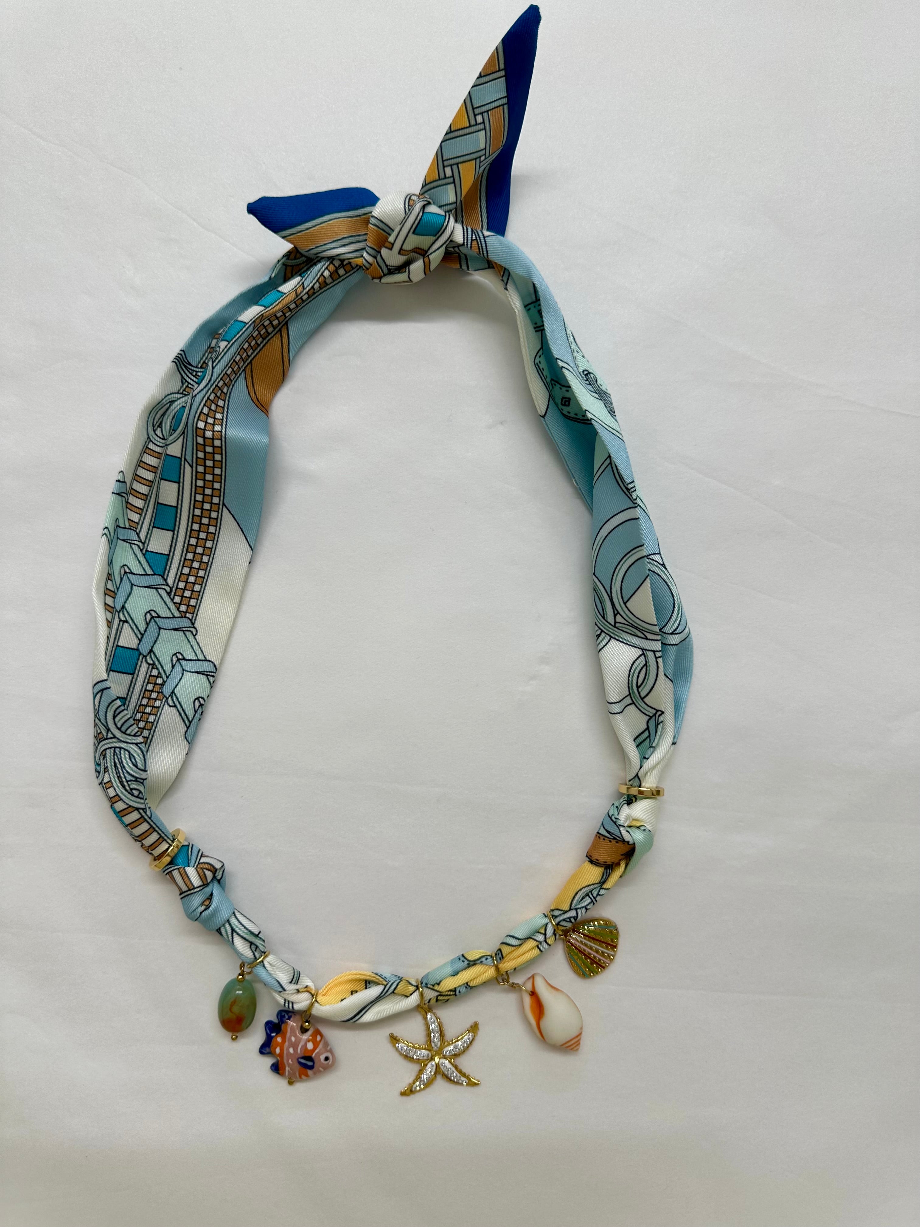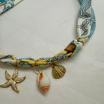 Say hello to your new favourite accessory—a scarf necklace that's basically a beach holiday in fabric form. Sprinkled with ocean-inspired charms, it's got all the coastal charm without the sand in your shoes. The real magic? Wear it loose around your neck for that effortless beachy vibe, or wrap it around your wrist as a bracelet when you fancy a change. One accessory, endless possibilities—because life's too short for boring jewellery.