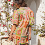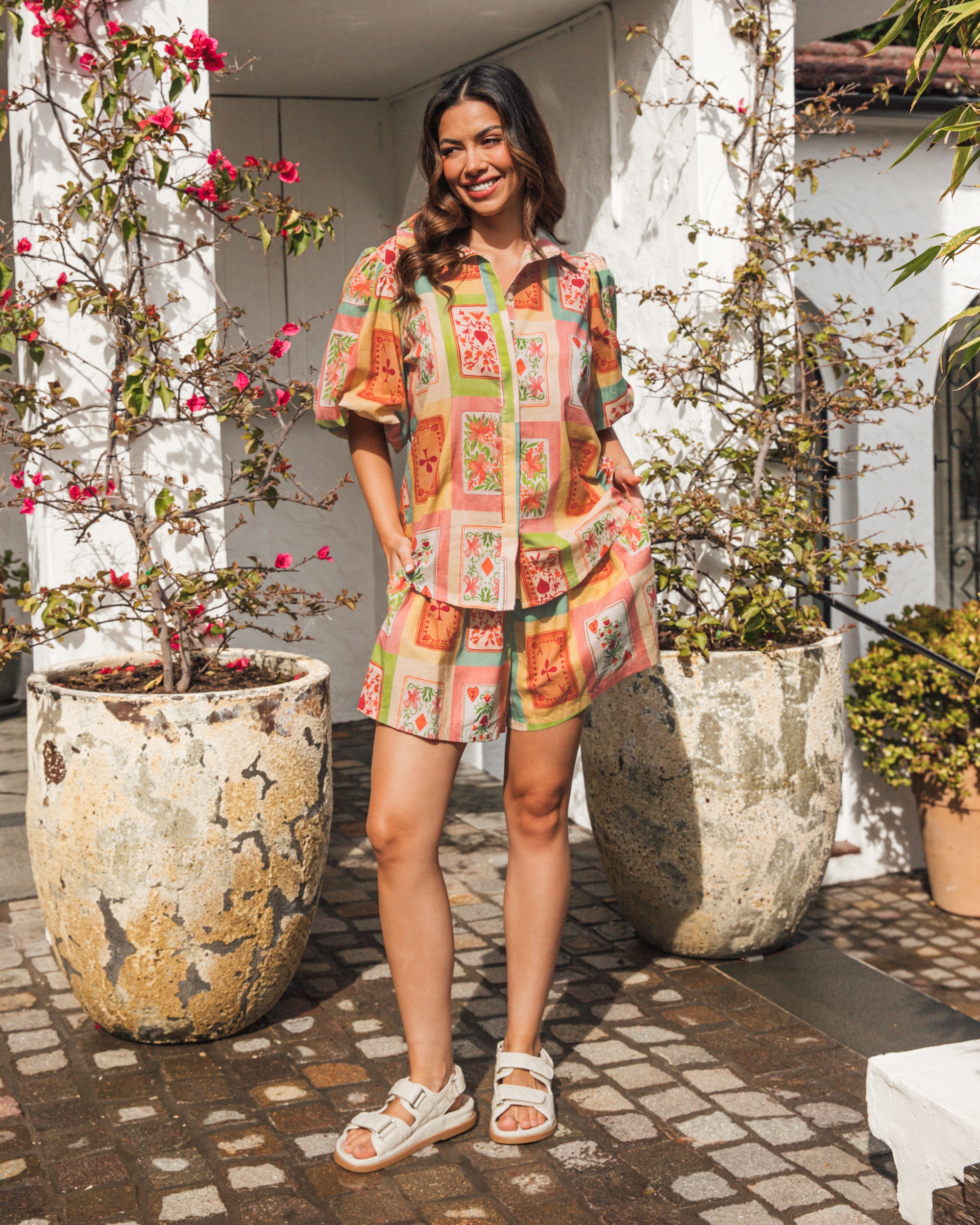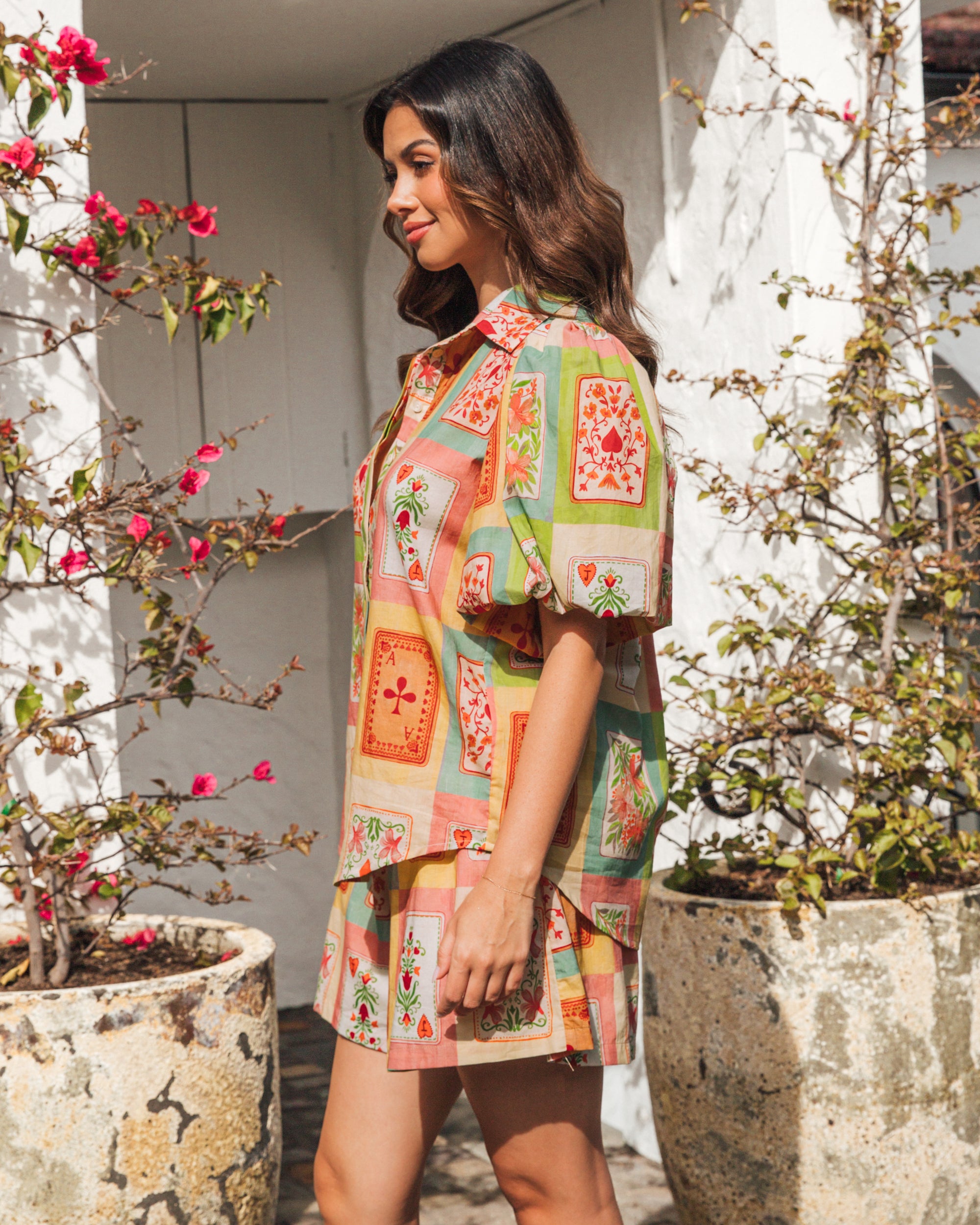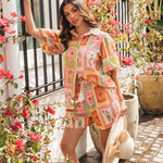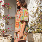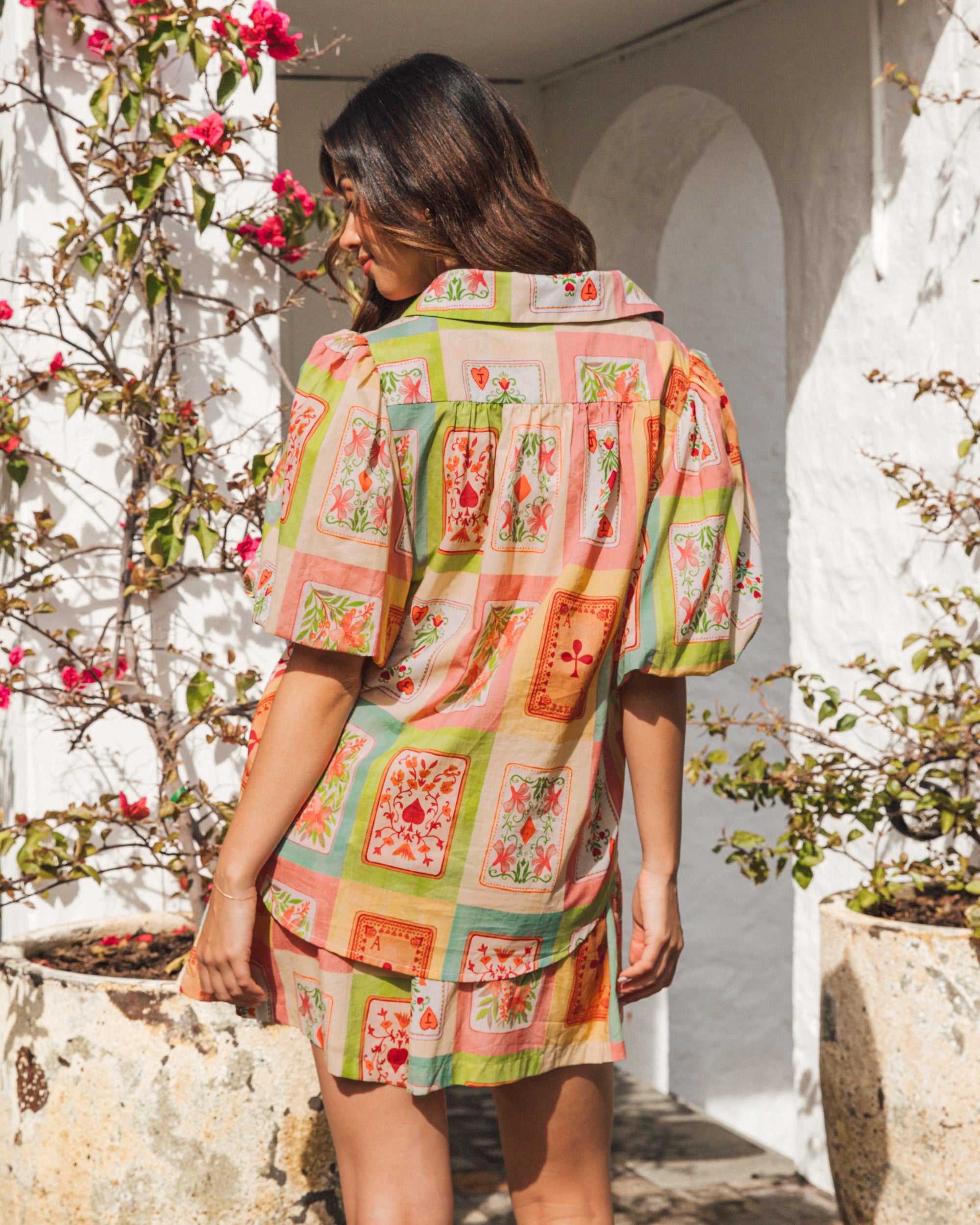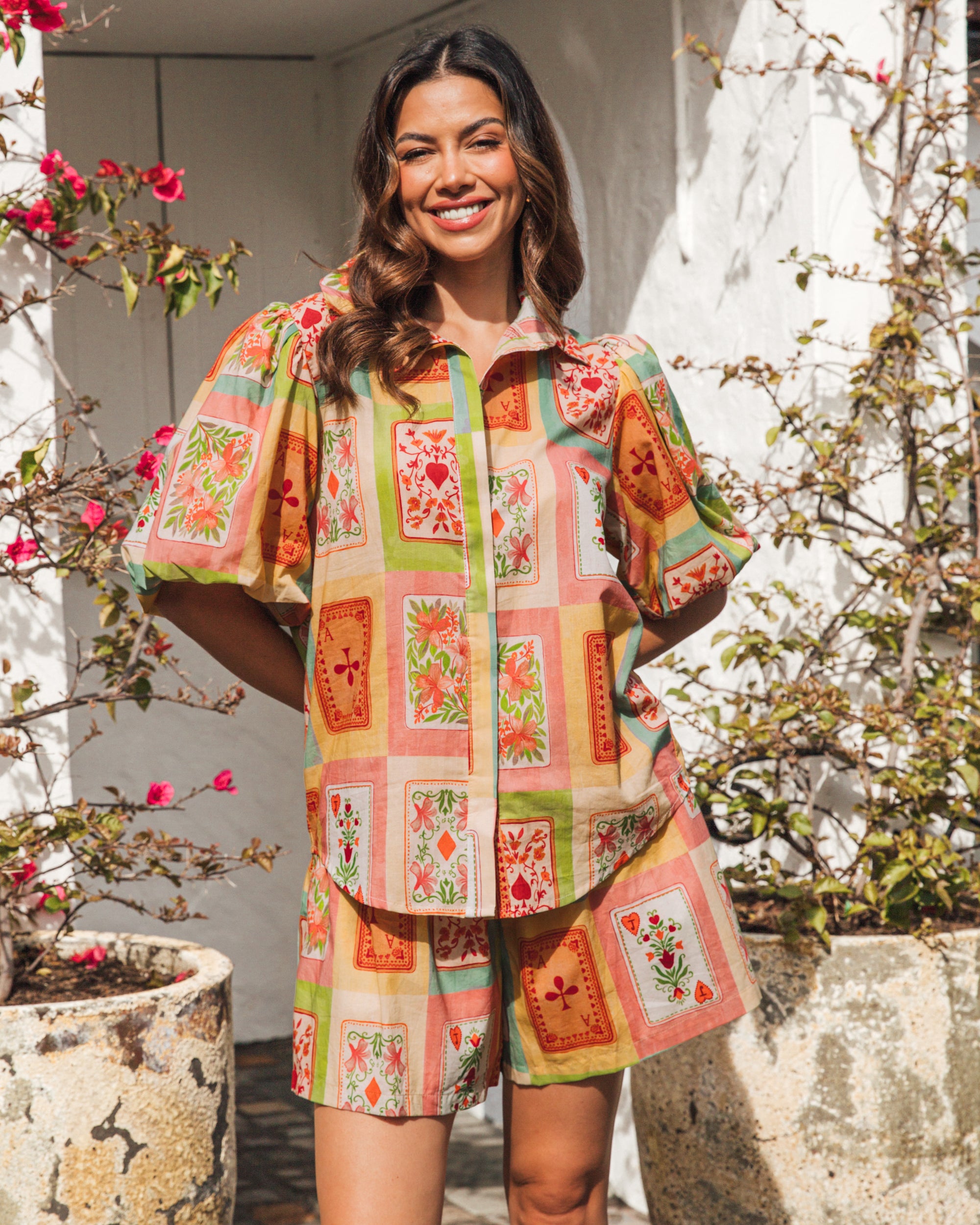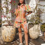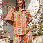 The Dream Lover Top features a luxuriously soft cotton-rayon blend for exceptional comfort. Its classic collar and button-front design are complemented by elegant puff sleeves and a beautiful print, creating a refined silhouette. Perfectly coordinated with the Dream Lover Shorts, this top offers a sophisticated ensemble for effortless style.