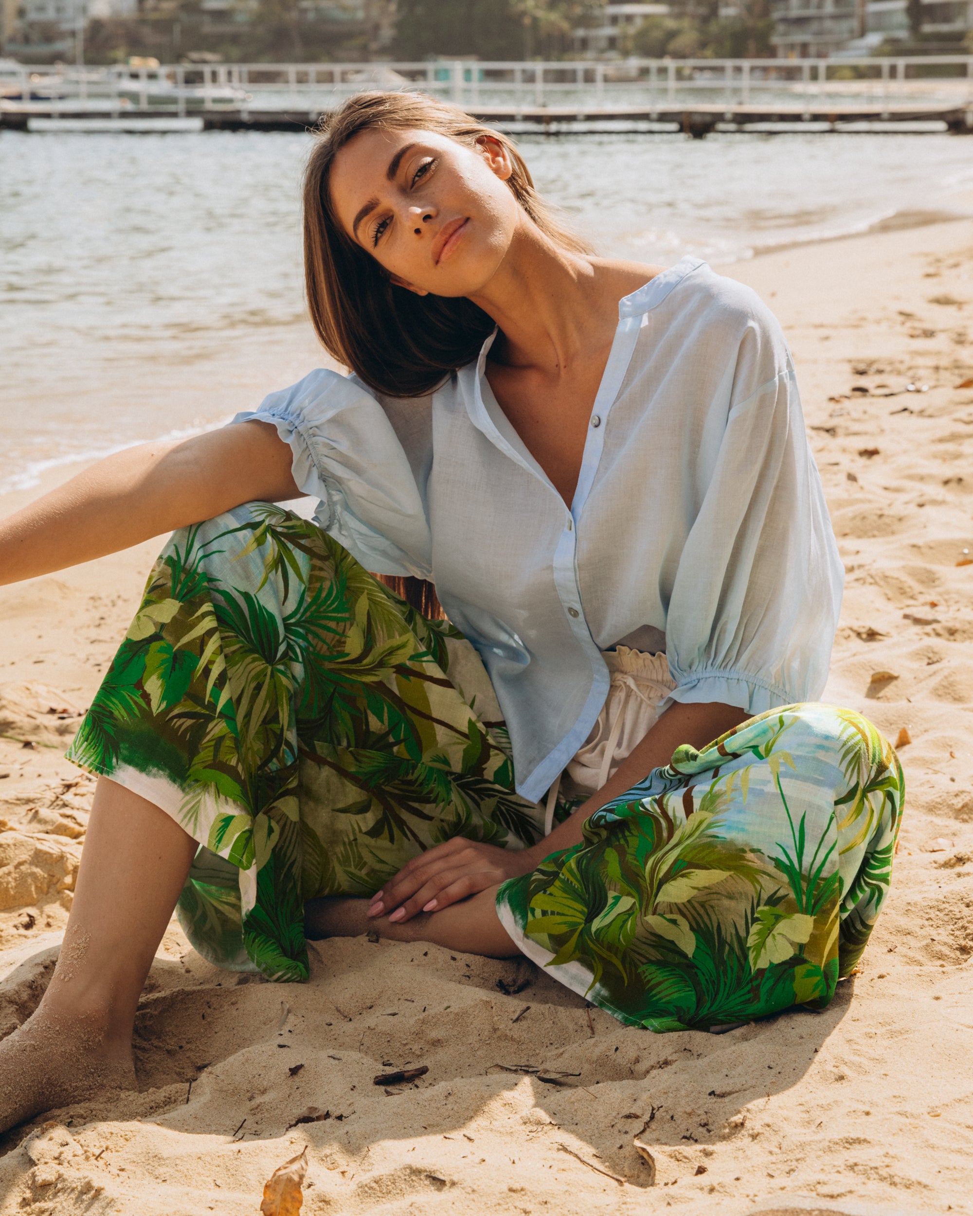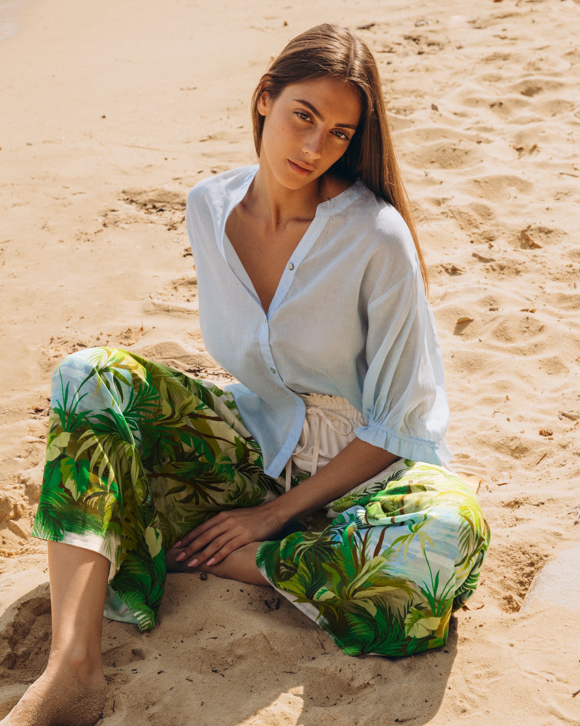 Effortlessly elegant, this Sahara blue shirt combines breathable linen and viscose for a lightweight, sophisticated drape. The button front design and thoughtfully detailed sleeves create visual interest, while the semi-sheer fabric invites layering possibilities. Perfect for warm weather styling, this piece transitions seamlessly from casual to refined occasions with understated grace.
